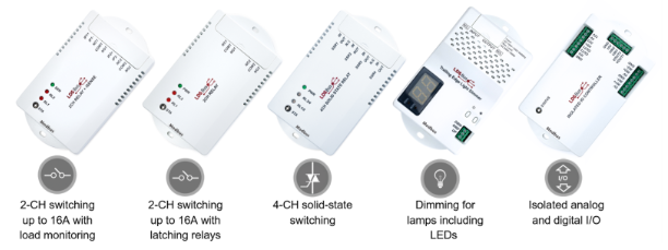 This can include switching actuators (with relays or solid-state switching), providing control of motors for shutters, window shades, ventilation fans, and HVAC systems to name but a few. Actuators can also control the intensity and colour of lighting via direct dimming or via standard lighting control protocols (such as DMX/DALI or 0-10V control) for example. Devices can also be integrated via IR control actuators which can mimic the InfraRed protocols used by dedicated remote controls. Advanced actuators can even report back information, such as current consumption for ventilation fan motors, allowing the system to confirm expected operation and helping with predictive maintenance.